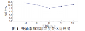 在料液比 10 ∶ 40(mL /mL)、抽提時間 8 h 的 條件下,由圖 1 可知:溫度升高可以提升油脂的萃 取率,降低殘油率。但當溫度達到 80℃時,殘油 率不再降低,這可能由于 80℃達到了蛋白質變性 的臨界溫度,溫度繼續升高蛋白質開始變性,火麻 油不飽和脂肪酸氧化增加,分子增大,水溶性降低, 導致萃取率降低,故 80℃為較優水平。