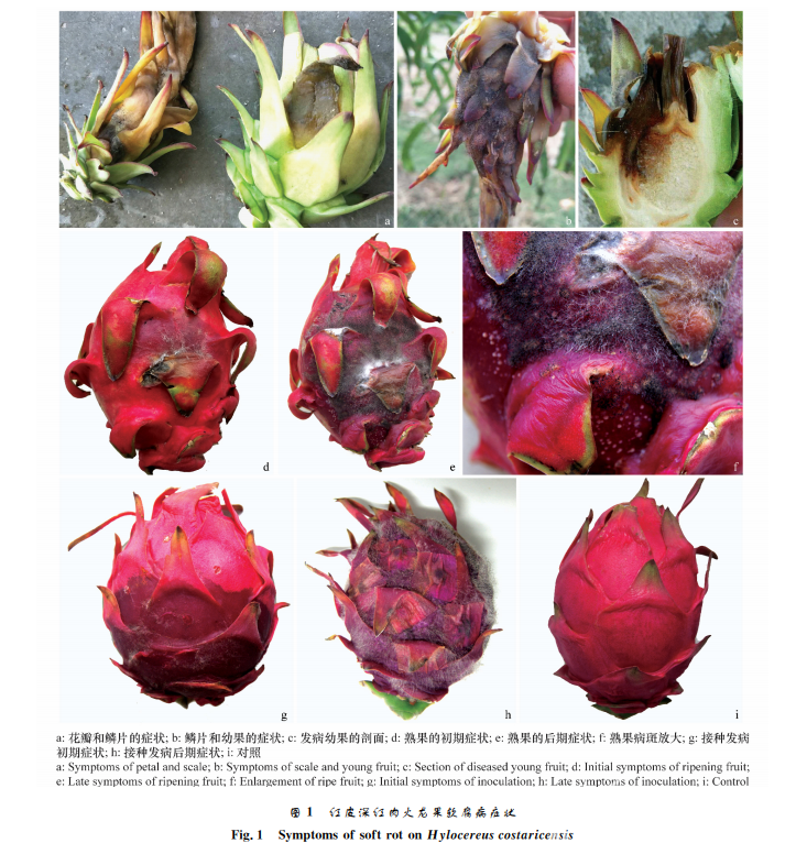 對(duì)健康的紅皮 深 紅 肉 火 龍 果 果 實(shí) 進(jìn) 行 接 種,以 無(wú)菌的 PDA 為對(duì)照,5d后針刺傷接種的果實(shí)全部 發(fā)病,接種產(chǎn)生的癥狀與田間發(fā)病的癥狀相同(圖 1g~h),而對(duì)照果實(shí)不發(fā)病(圖1i)。對(duì)發(fā)病組織進(jìn) 行再分離,可得到與原分離株相同的病原菌,符合柯 赫氏法則,證明接種菌為火龍果軟腐病的致病菌。