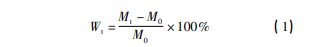 利用恒溫恒濕箱,使面板復(fù)合材料、PMI 泡沫 和 PMI 泡沫夾層結(jié)構(gòu)復(fù)合材料試樣在相應(yīng)環(huán)境 中持續(xù)吸濕。在吸濕的前 24 h,每 12 h 對(duì)其吸濕 率 Wt 進(jìn)行測(cè)試; 24 h 后,每 24 h 對(duì)吸濕率 Wt 進(jìn) 行測(cè)試。本文使用稱量法表征試樣的吸濕率 Wt ( 見式 1) 。