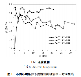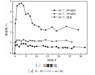 圖 1 為面板復(fù)合材料試樣在不同吸濕環(huán)境中 的吸濕率 - 時(shí)間曲線。從圖中可見,五種吸濕環(huán) 境中,面板復(fù)合材料的大部分吸濕都集中在吸濕 初期的 24 h 內(nèi),即吸濕初期吸濕率快速增加,隨 后吸濕率有所波動(dòng),最終都到達(dá)平衡。不同濕度 環(huán)境中( 見圖 1( a) ) ,面板復(fù)合材料的吸濕行為 相差很大,環(huán)境的濕度越大,試樣的吸濕速率和飽 和吸濕率也越大,85% RH、95% RH 和浸水三種濕 度下面板的飽和吸濕率分別為 0. 57% 、1. 18% 、 2. 36% 。同時(shí)發(fā)現(xiàn),在高濕度環(huán)境 85% RH、95% RH 中,面板復(fù)合材料的吸濕率波動(dòng)較小,而浸水 環(huán)境中面板復(fù)合材料的吸濕率有明顯的下降,這 是由于浸水環(huán)境更為惡劣,浸水對(duì)面板復(fù)合材料 的損傷更大,使試樣表面溶解和剝落等質(zhì)量損失 的程度和范圍大于高濕度環(huán)境,且面板復(fù)合材料 本身質(zhì)量較小,在吸濕率曲線上表現(xiàn)為吸濕率顯 著下降。不同溫度環(huán)境中( 見圖 1 ( b) ) ,面板復(fù) 合材料的吸濕率曲線更加相近,吸濕速率沒有明 顯的規(guī)律,吸濕后期都有部分波動(dòng),其中 70 ℃ 時(shí) 面板復(fù)合材料的吸濕率下降最多,其次為 60 ℃環(huán) 境下的,50 ℃ 環(huán)境下試樣的吸濕率穩(wěn)定上升,沒 有明顯的下降過程。這可能是因?yàn)榄h(huán)境溫度越 高,吸濕過程中材料的剝離、脫粘等不可逆損失越 多。最終50 ℃、60 ℃、70 ℃三種環(huán)境中面板復(fù)合 材料 的 飽 和 吸 濕 率分別為 0. 85% 、0. 57% 、 0. 51% ,三個(gè)飽和吸濕率較為接近。與環(huán)境溫度 相比,濕度對(duì)面板復(fù)合材料吸濕行為的影響更大。