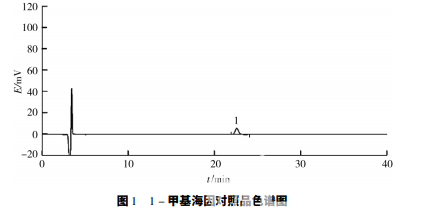 本文采用二極管陣列( DAD) 檢測器進行全波長掃描,得到 1 - 甲基海因在 215 nm 有較大的吸收峰,且與 鄰近色譜峰分離度較好,且基線平穩(wěn),故選擇在該波長下進行檢測。