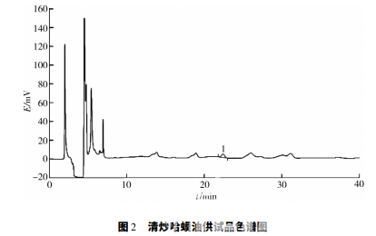 分別取對照品溶液、清炒哈蟆油供試品溶液,按照上述色譜條件進行分析,結(jié)果如圖 1 和圖 2,待測色譜 峰與相鄰色譜峰基本分離,理論塔板數(shù)按 1 - 甲基海因峰計算均不低于 3 000。