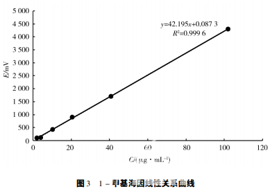 精密吸取上述配制好的 1 - 甲基海因?qū)φ掌纺敢?0. 2、0. 4、1. 0、2. 0、4. 0 mL 分別置 10 mL 量瓶中,加甲 醇稀釋定容到刻度,搖勻,使質(zhì)量濃度分別為 2. 04、4. 08、10. 20、20. 40、40. 80、102 μg /mL。將 6 種溶液分別 注入高效液相色譜儀中,按照色譜條件進行測定。繪制標準曲線( 圖 3) ,得回歸方程 y = 42. 195x + 0. 087 3 ( R2 = 0. 999 6) ,結(jié)果表明,1 - 甲基海因質(zhì)量濃度在 2. 04 ~ 102 μg /mL 范圍線性關(guān)系良好。
