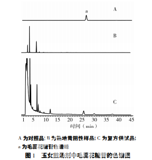 對照品溶液: 精密稱取毛蕊花糖 苷對照品 5.96 mg,用 16%乙腈定容于 5 ml 容量瓶, 即得。 復(fù)方供試品溶液: 按經(jīng)方組成稱取藥材,加入6 倍量水,武火煎煮 5 min 后文火 30 min,取制得的 復(fù)方 水 提 液 1 ml,用 甲 醇 定 容 至 2 ml 容 量 瓶, 0.45 μm微孔濾膜過濾,即得。 熟地黃陰性樣品溶液: 按經(jīng)方組成稱取除熟地 黃以外的藥材,按“復(fù)方供試品溶液”項(xiàng)下的方法制 備,即得。