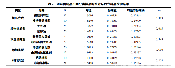 通過對樣品分類統(tǒng)計和分別進(jìn)行獨(dú)立樣品 t 檢驗(yàn) 得到如下表 2,包括按產(chǎn)品制作方式、原料用油種類、 原料用油的轉(zhuǎn)基因與否、添加抗氧化劑與否及包裝質(zhì) 地為鋁箔材料與否 5 方面進(jìn)行分類分析,并統(tǒng)計了各組分類的觀測量個數(shù)、平均數(shù)、標(biāo)準(zhǔn)差和平均數(shù)的標(biāo) 準(zhǔn)誤差。其中僅有添加抗氧化劑類型的分析檢驗(yàn) sig< 0. 05,所以表明調(diào)味面制品的酸價值的大小與抗氧化 劑的添加與否有顯著差異,其余均無顯著差異。