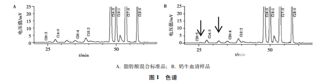 脂肪酸混合標準品色譜和奶牛血清樣品色譜見圖 1。脂肪酸混合標準品色譜圖中,8 種脂肪酸全部達 到基線分離。奶牛血清樣品色譜圖中,在 25. 694、 32. 050 min 存在 2 個未定義峰 ( 圖 1B 箭頭處) ,推 測可能分別是正 - 十二烷酸 ( C12 ∶ 0) 和亞麻酸 ( C18 ∶ 3) 。奶牛血清中,二十二碳六烯酸 ( C22 ∶ 6) 未檢出。